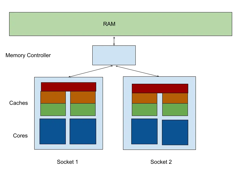 A traditional Uniform Memory Access (UMA), symmetric multiprocessing server (2 cores per socket, 2 sockets) has every core accessing an external memory controller as such: