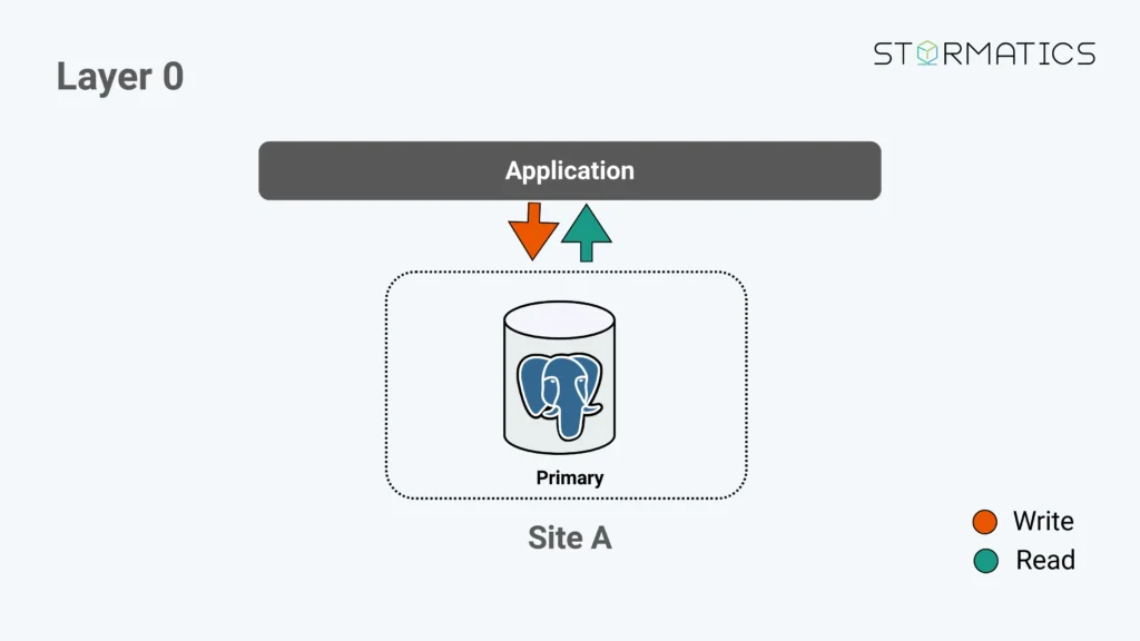 This is the baseline: one PostgreSQL primary in one site. All reads and writes go to it.