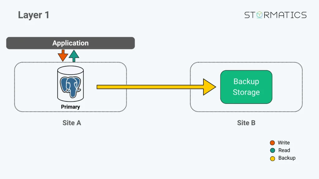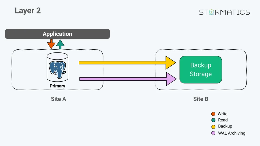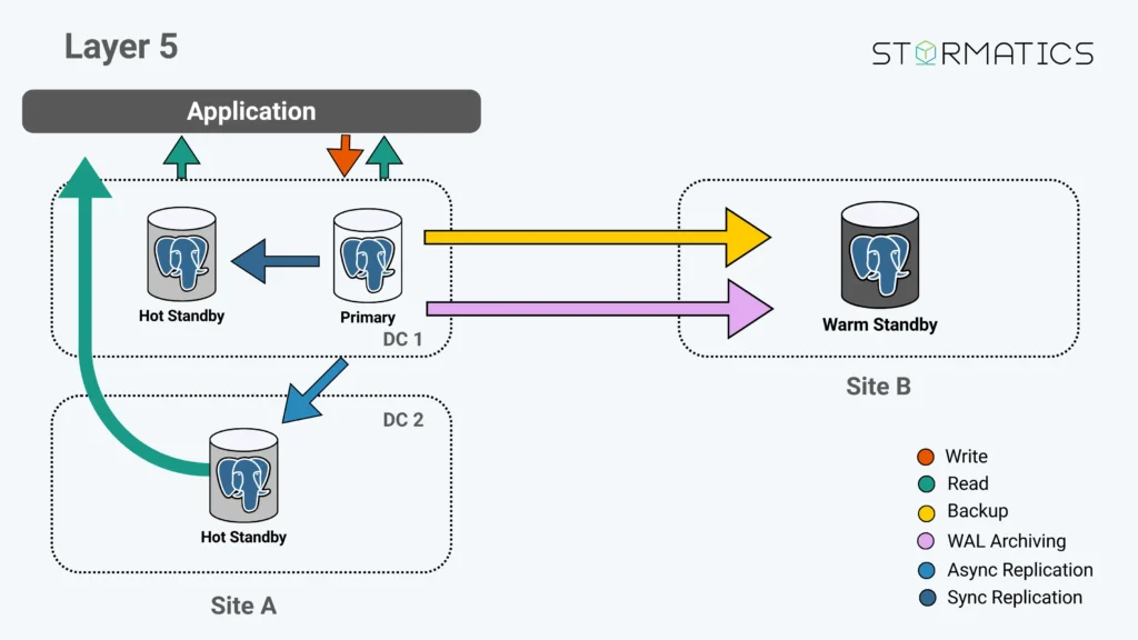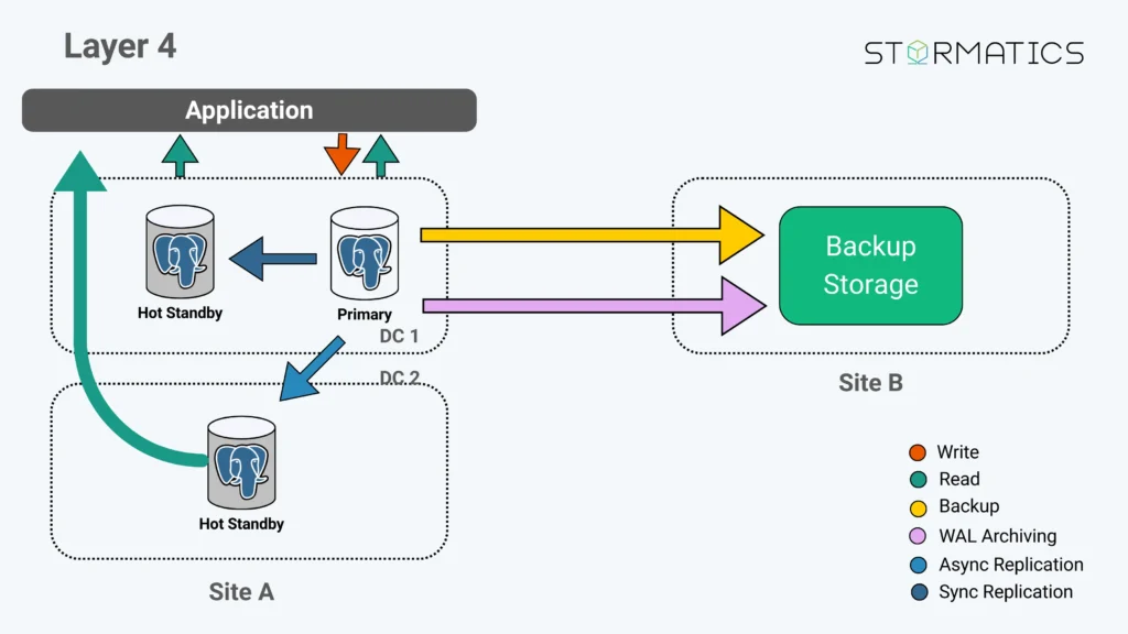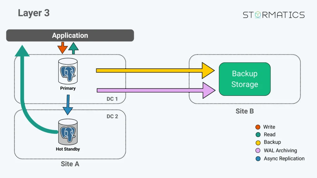 Layer 3 keeps backups + WAL archiving, and adds a hot standby in Site A (often in a different zone or DC).