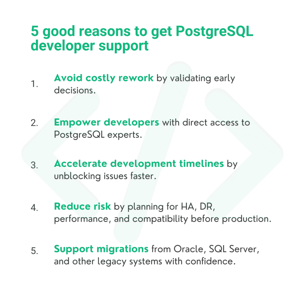 > Technical Q&A: On-demand access to expert advice for day-to-day challenges, development blockers, or PostgreSQL behavior.